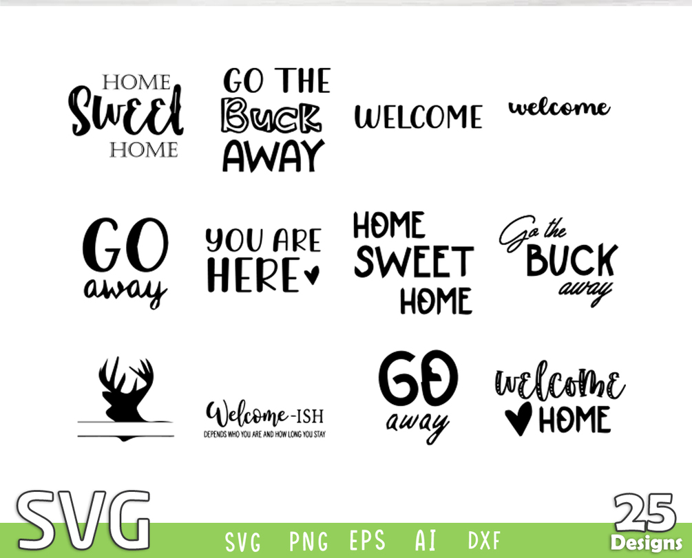 Give your space a warm (or sarcastic) welcome with this Funny Welcome Home SVG Bundle! Featuring 25 stylish and rustic designs with phrases like “Home Sweet Home”, “Welcome-ish”, and the cheeky “Go the Buck Away”, this bundle is perfect for farmhouse signs, front porch decor, DIY home gifts, and laser or vinyl craft projects. Comes in SVG, PNG, EPS, AI, and DXF formats—ready to cut, print, or engrave.